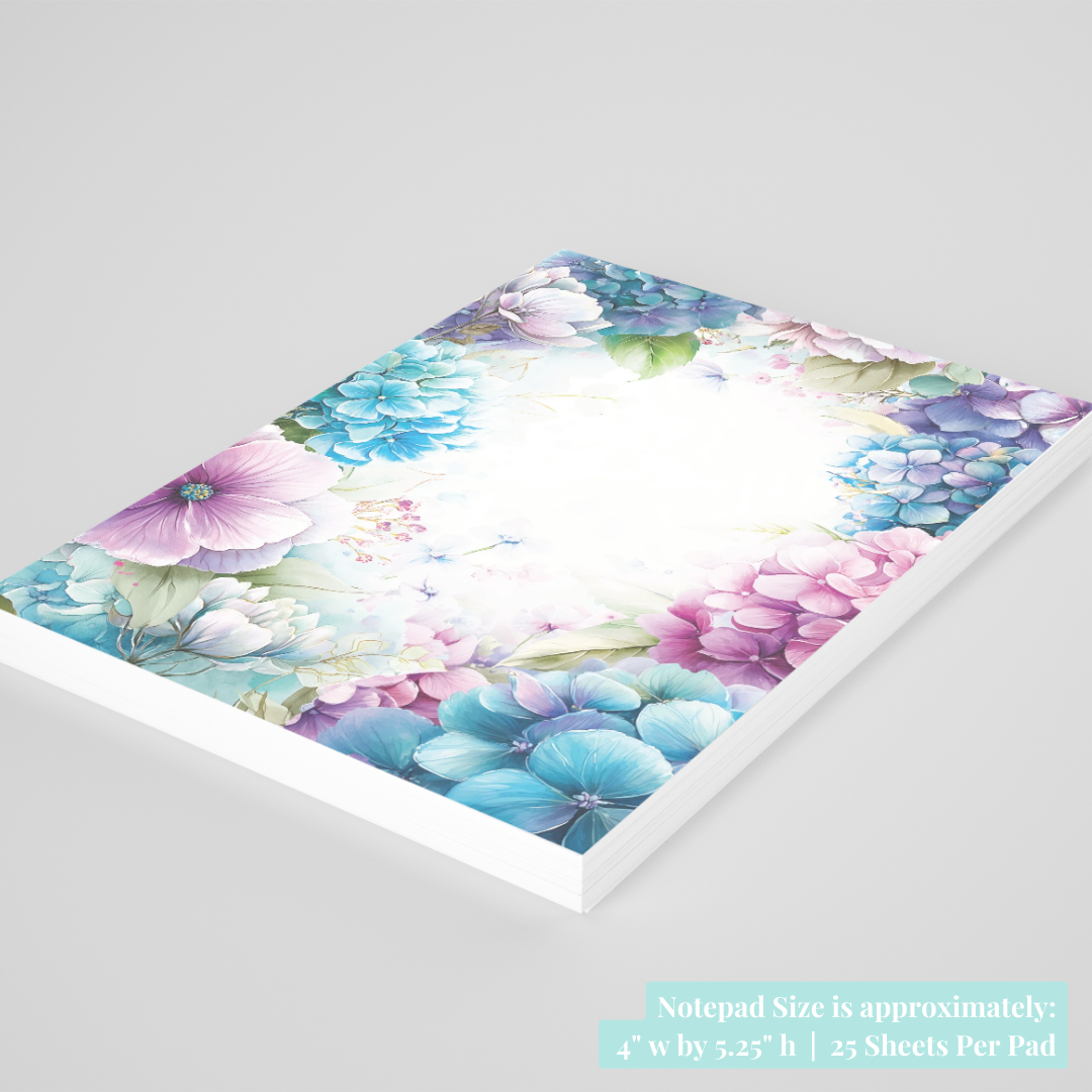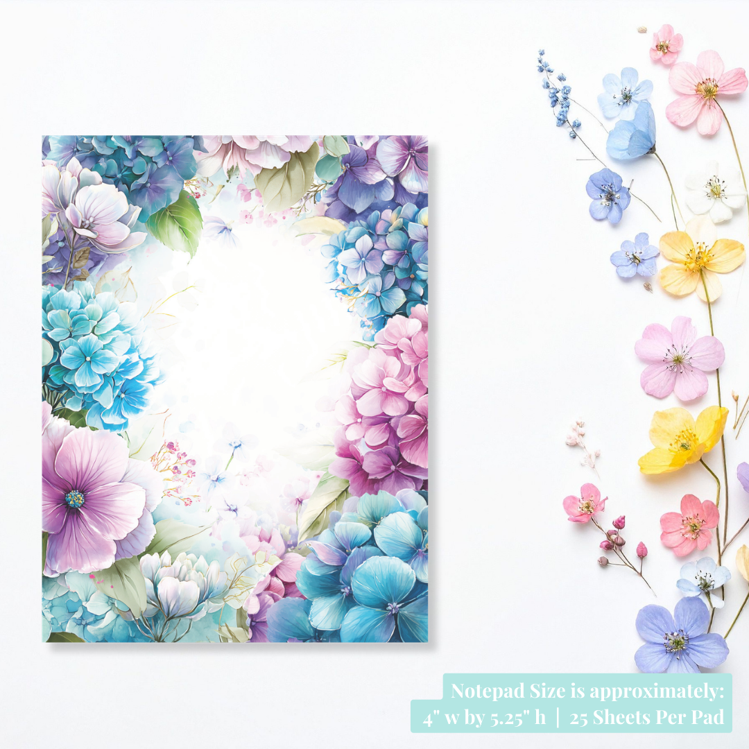 Soft, romantic, and filled with layered botanical detail, this floral paper notepad features a lush frame of hydrangeas and delicate blooms in shades of aqua, soft teal, blush pink, lavender, and fresh green. The flowers cascade inward from all four sides, creating a dreamy conservatory-inspired border while leaving a bright, open centre for writing. The overall look feels airy and painterly, with gentle watercolour blending that gives it that light-filled greenhouse atmosphere. Designed to coordinate beautifully with The Luminous Conservatory Greenhouse sticker kit, this notepad brings the same elegant botanical aesthetic to your desk and planner setup.