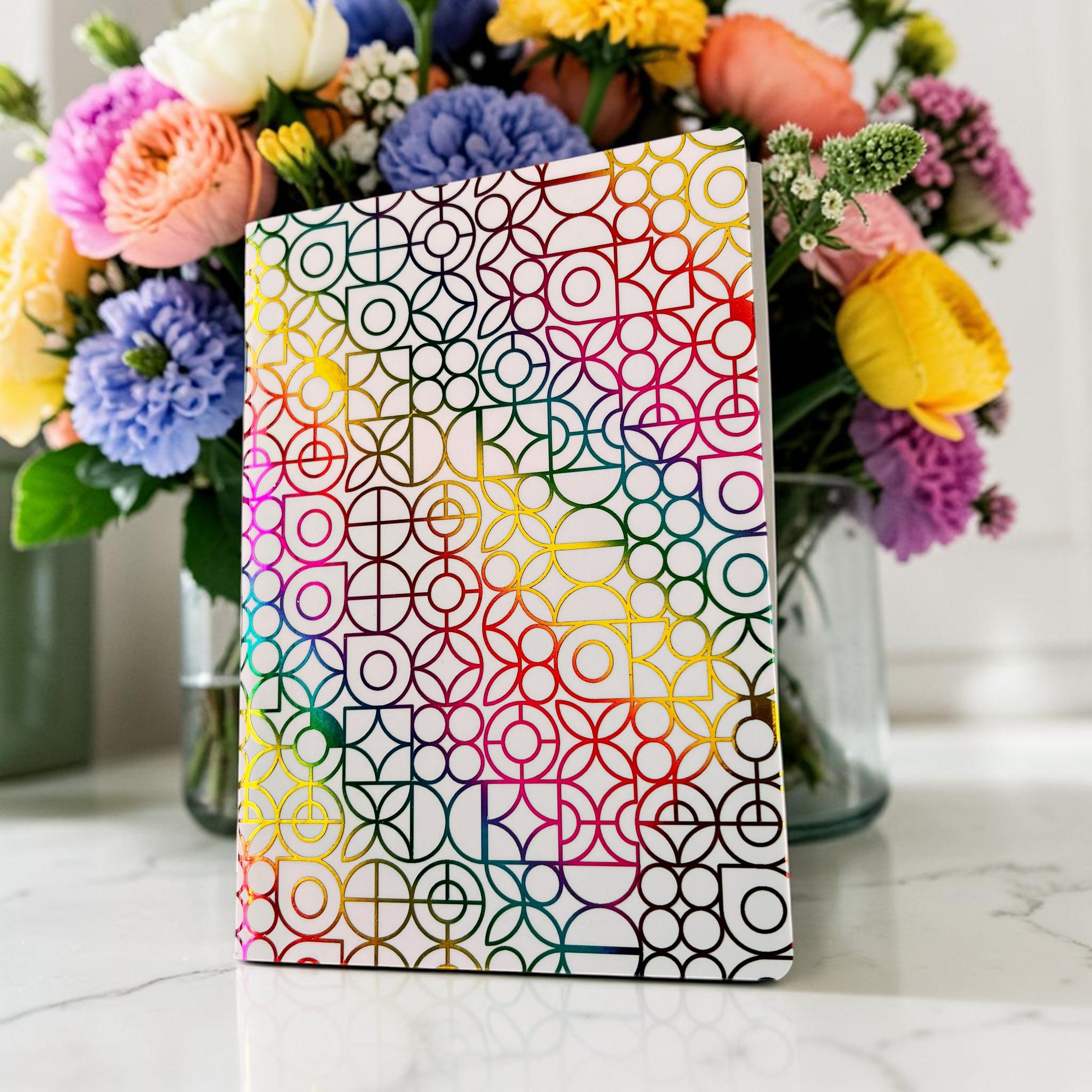 A crisp, clean backdrop lets the geometric foil pattern take centre stage, shifting through vibrant tones as it catches the light. The structured design feels bright and modern, with each angle reflecting a slightly different hue across the surface. It has that fresh, polished look that feels light, airy, and full of movement without feeling busy.