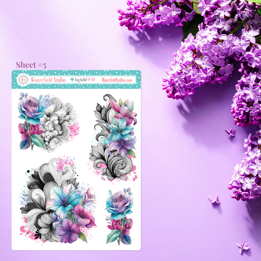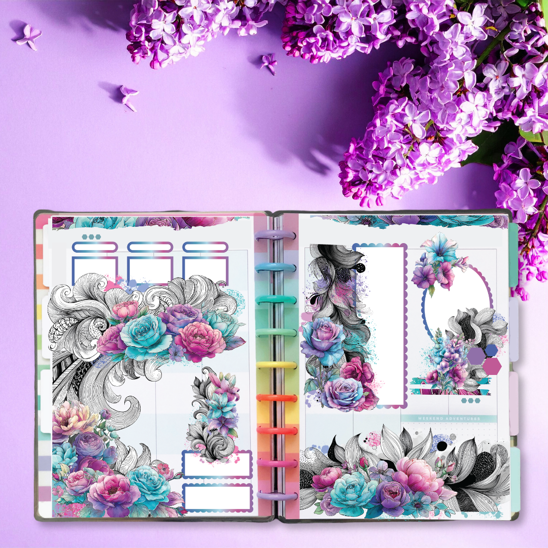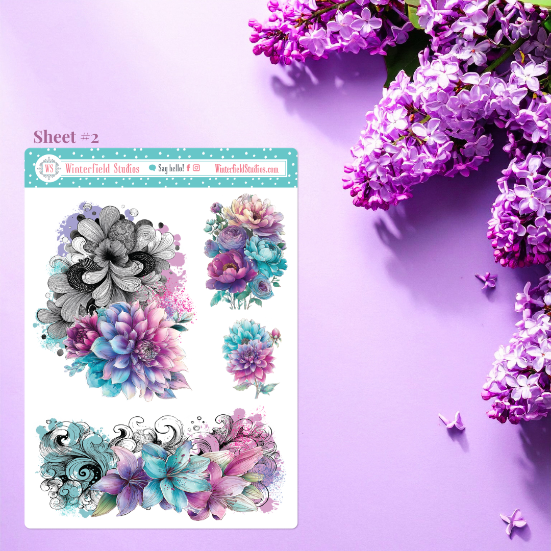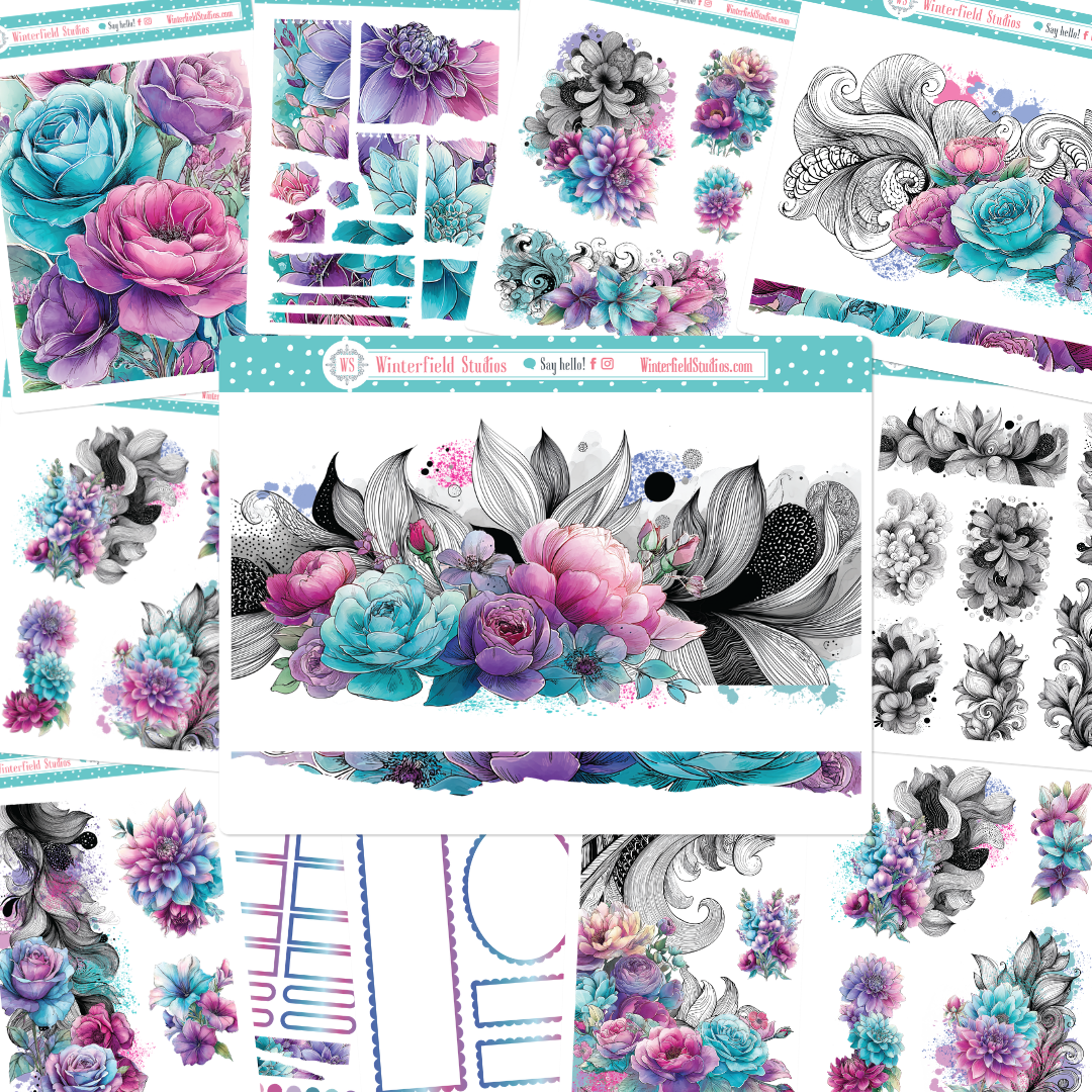 Designed for planners, bullet journals, scrapbooks, and memory-keeping pages, this kit includes a stunning mix of florals such as roses, peonies, dahlias, petunias, lilies, and anemones, along with flowing ornamental line art, paint splatters, and coordinating decorative elements. The colour palette combines teal, aqua, lavender, violet, and magenta pinks for a dramatic yet elegant look that works beautifully year-round.