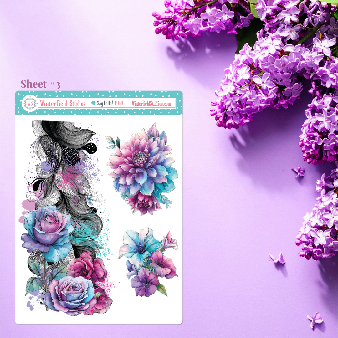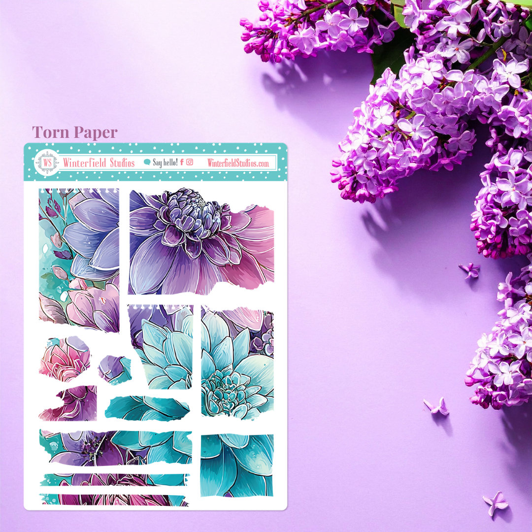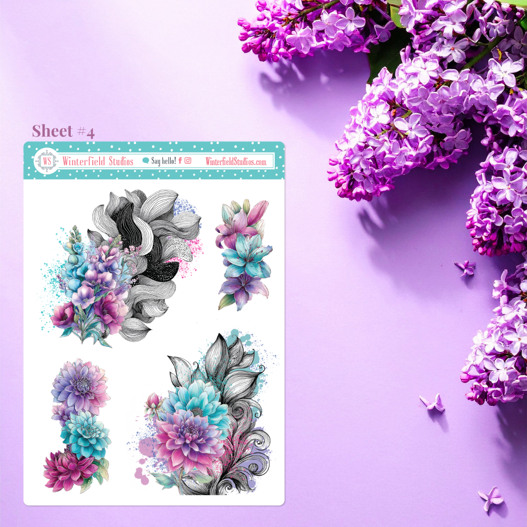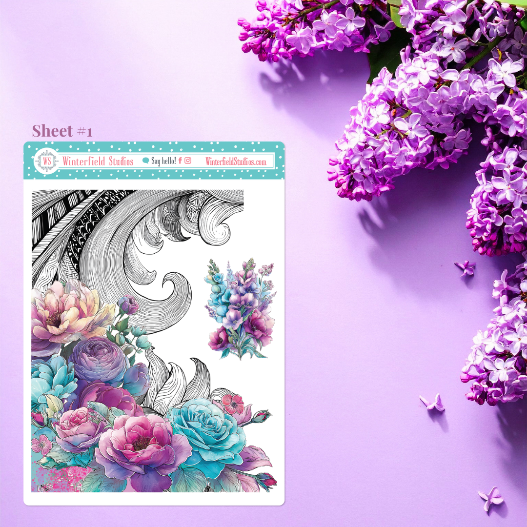 Designed for planners, bullet journals, scrapbooks, and memory-keeping pages, this kit includes a stunning mix of florals such as roses, peonies, dahlias, petunias, lilies, and anemones, along with flowing ornamental line art, paint splatters, and coordinating decorative elements. The colour palette combines teal, aqua, lavender, violet, and magenta pinks for a dramatic yet elegant look that works beautifully year-round.