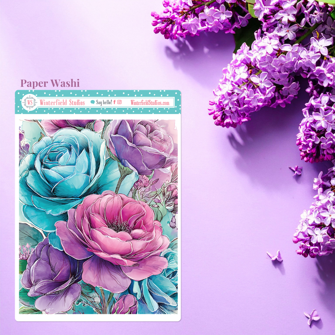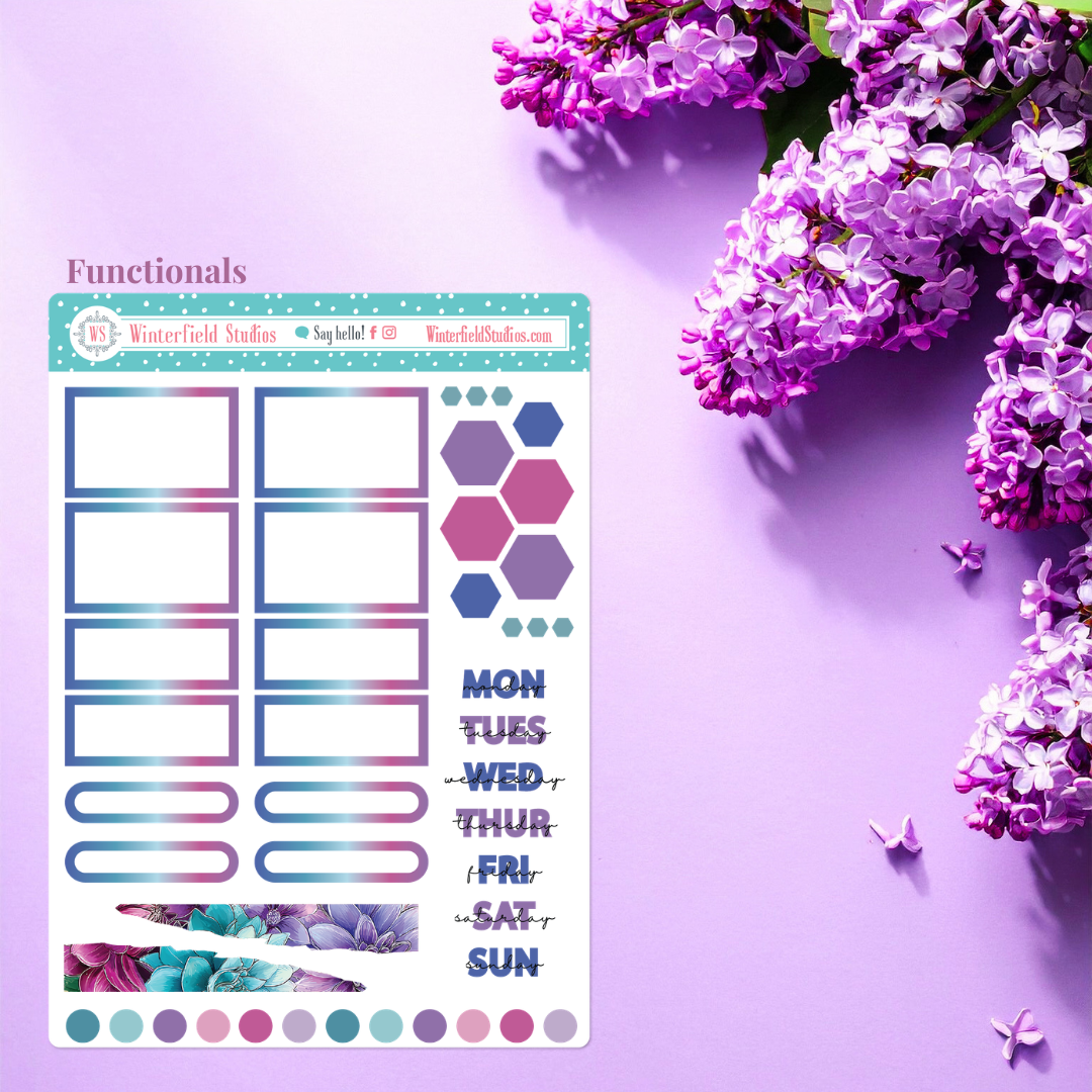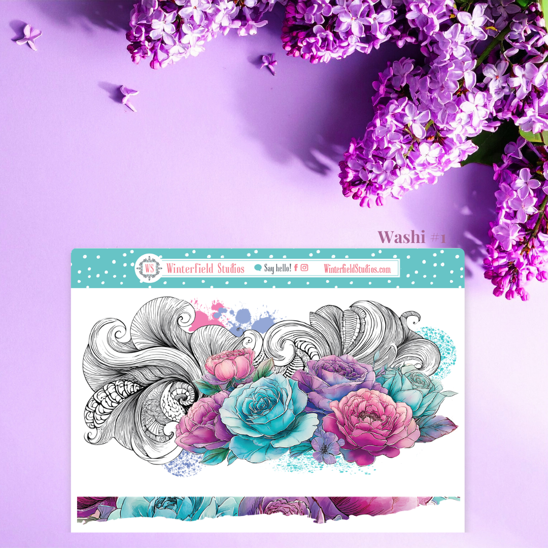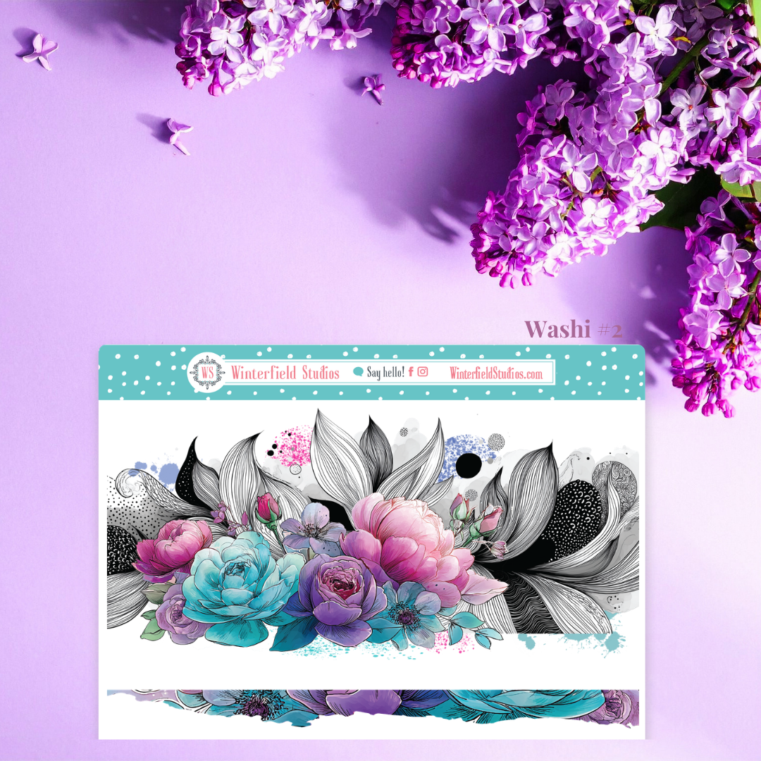 Designed for planners, bullet journals, scrapbooks, and memory-keeping pages, this kit includes a stunning mix of florals such as roses, peonies, dahlias, petunias, lilies, and anemones, along with flowing ornamental line art, paint splatters, and coordinating decorative elements. The colour palette combines teal, aqua, lavender, violet, and magenta pinks for a dramatic yet elegant look that works beautifully year-round.