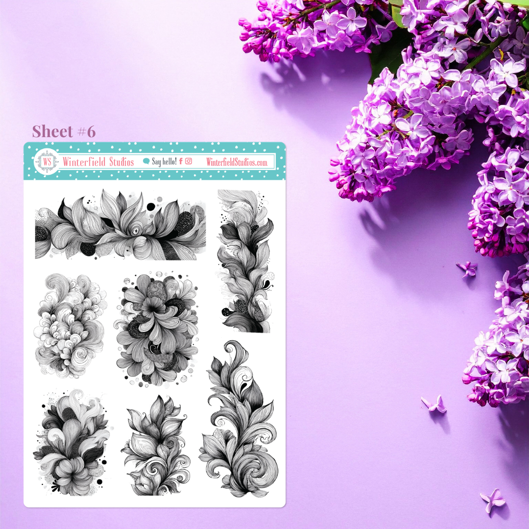Ink In Bloom is a striking floral planning and journaling sticker kit that blends elegant black and white zentangle ink line drawing illustrations with vibrant watercolour gouache florals. This 12-sheet planner sticker kit features richly detailed blooms layered over flowing zentangle line art, creating a beautiful contrast between bold ink patterns and soft painterly colour.