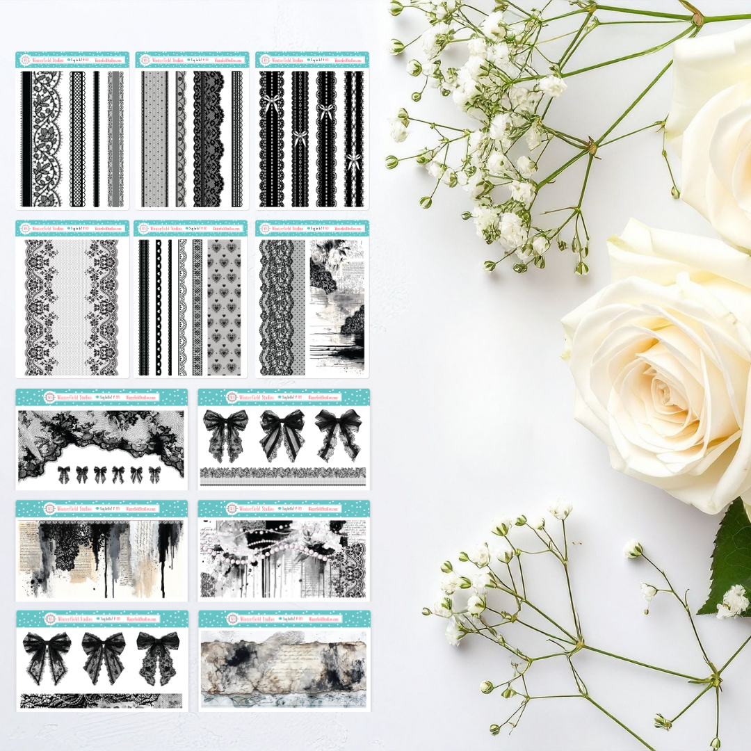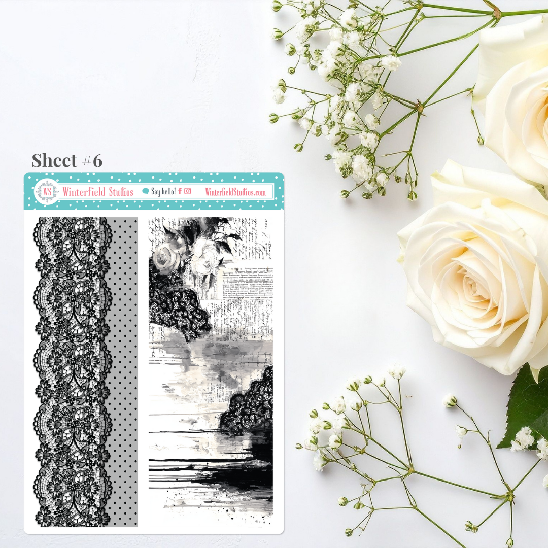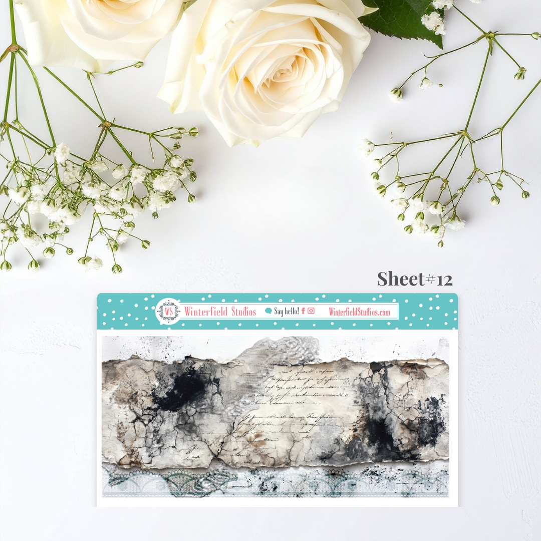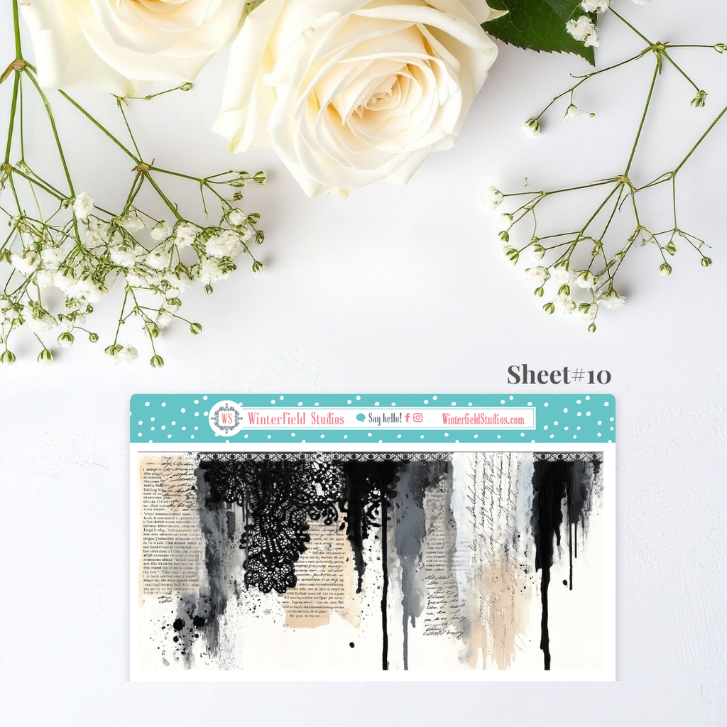 • 12 full sticker sheets (each packed with unique lace patterns, borders, torn edges, paint-splashed backdrops, and mixed-paper collages)