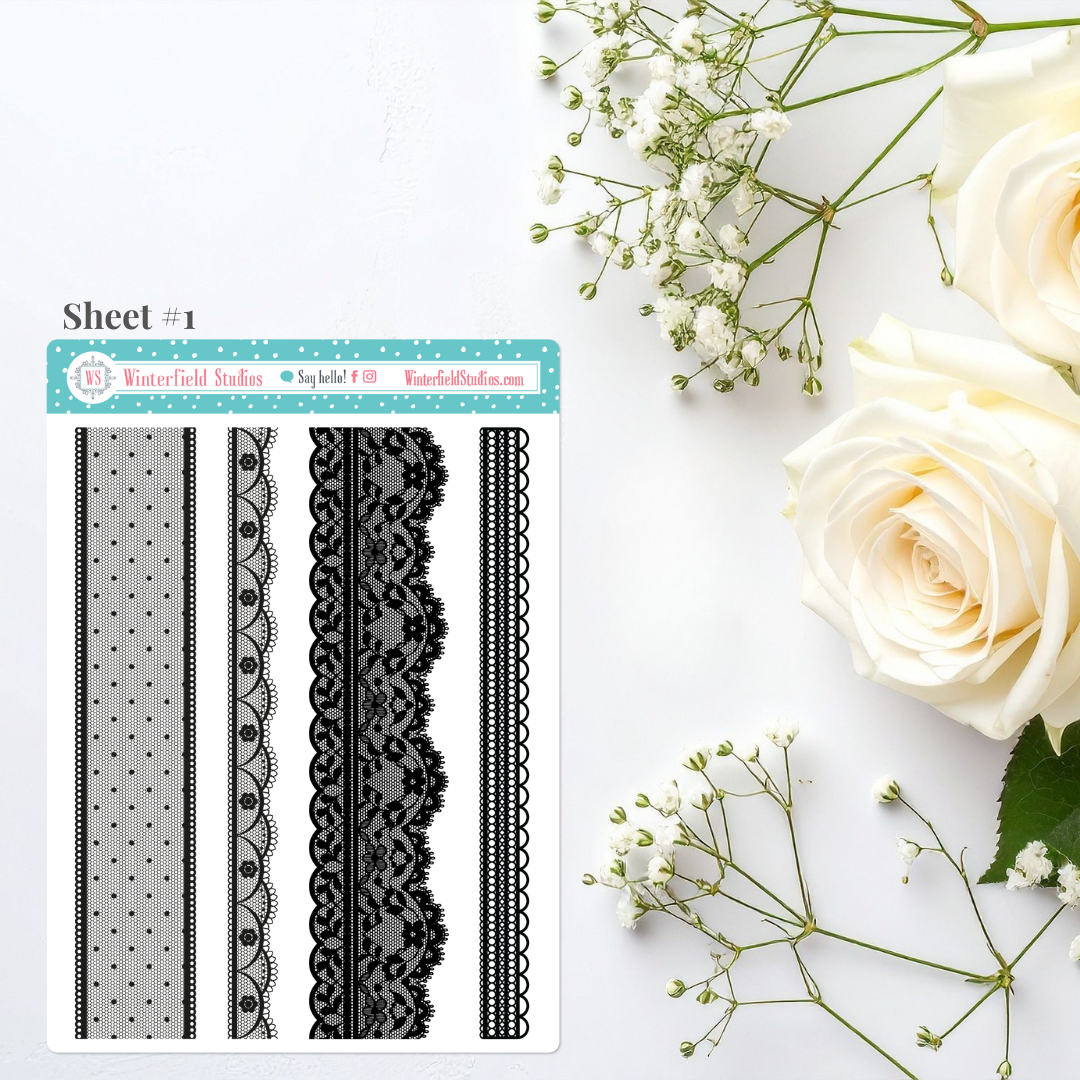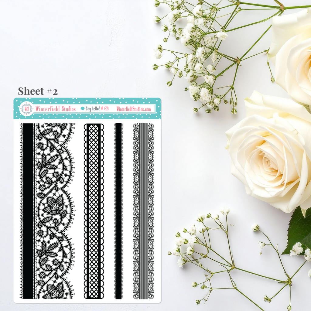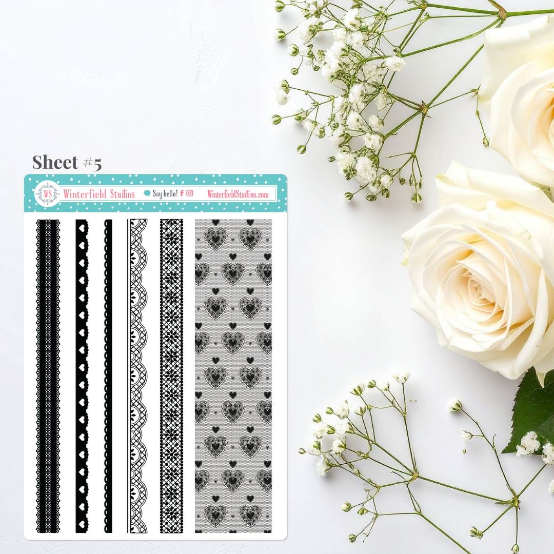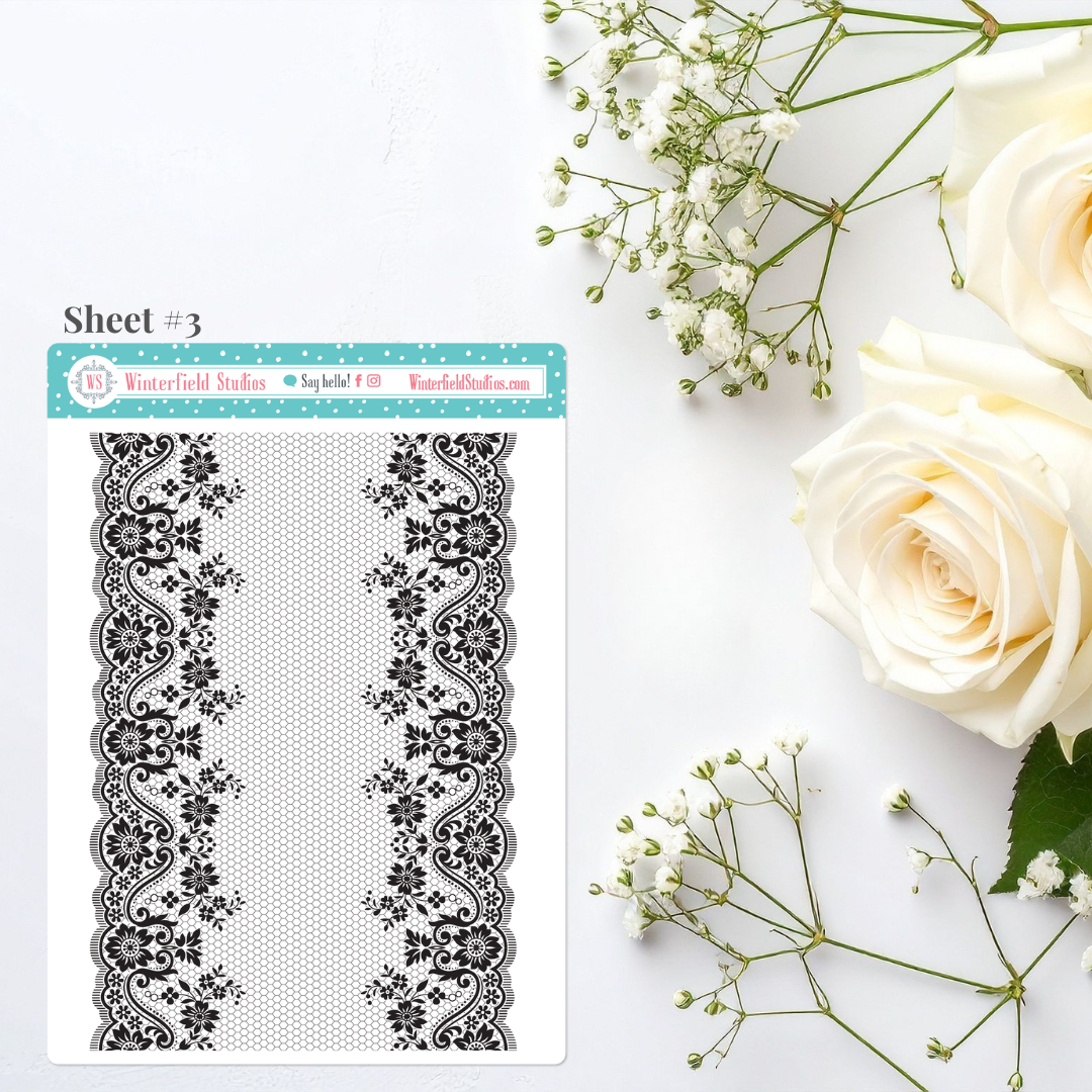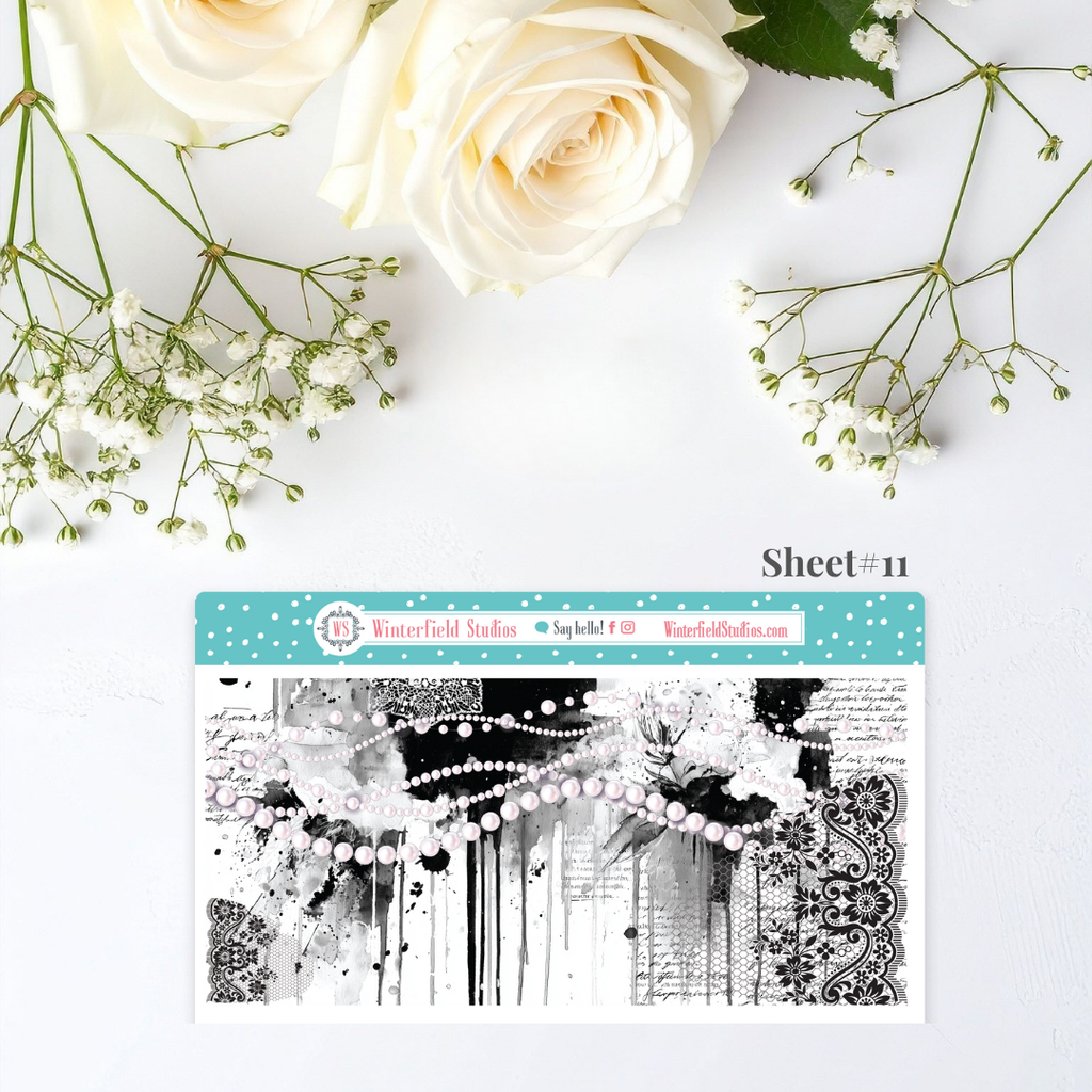 • 12 full sticker sheets (each packed with unique lace patterns, borders, torn edges, paint-splashed backdrops, and mixed-paper collages)