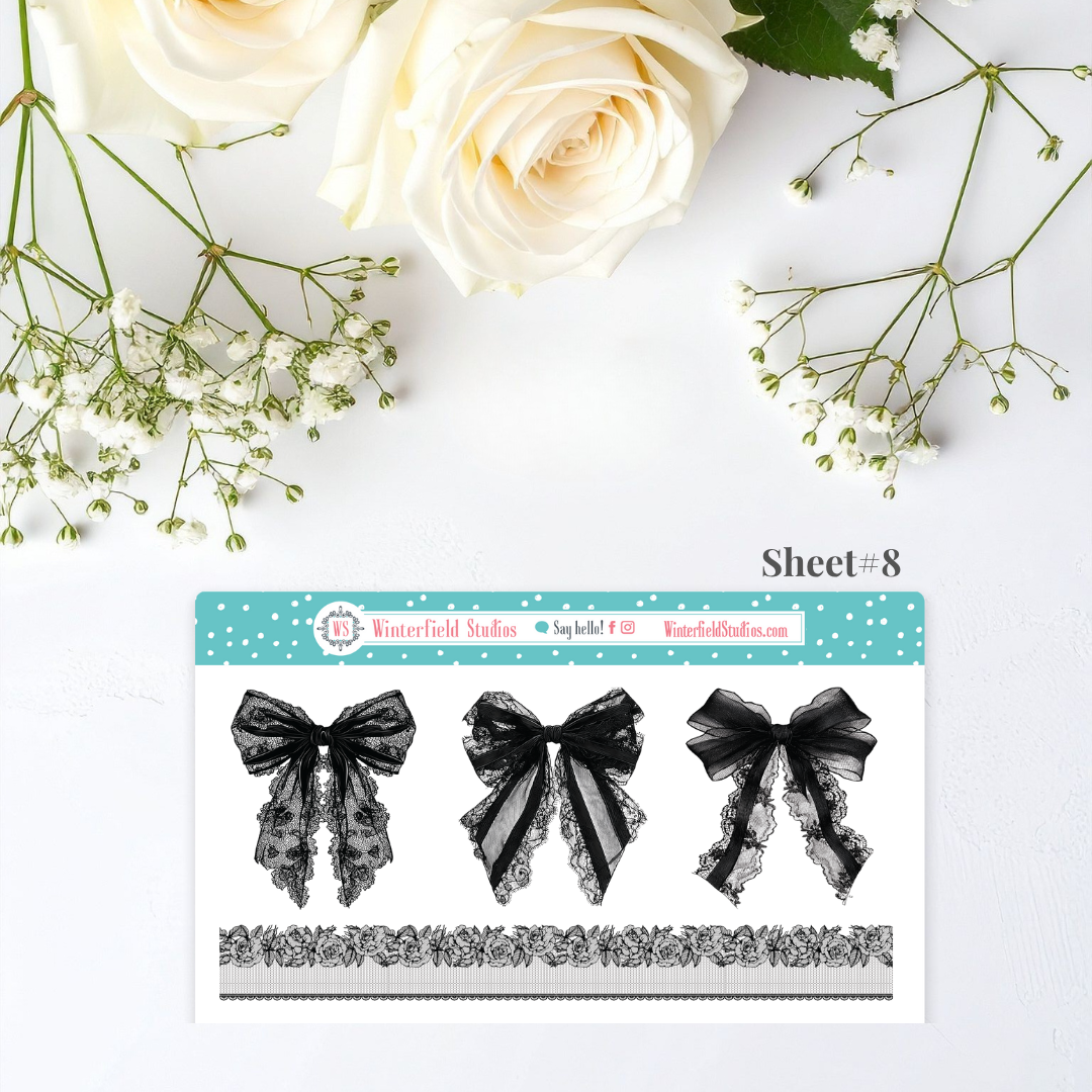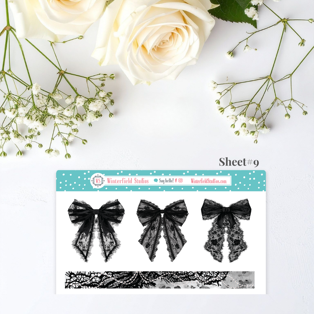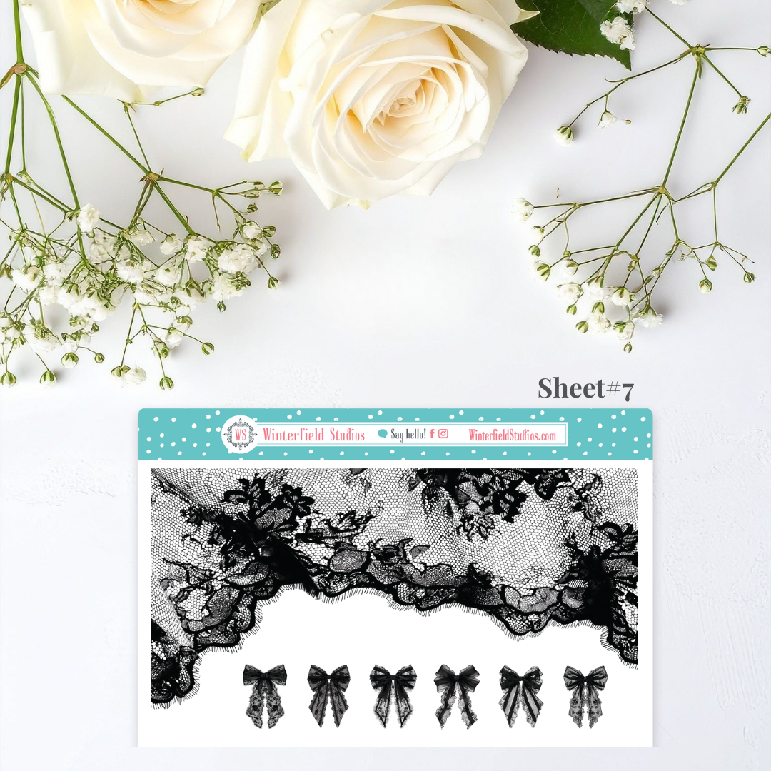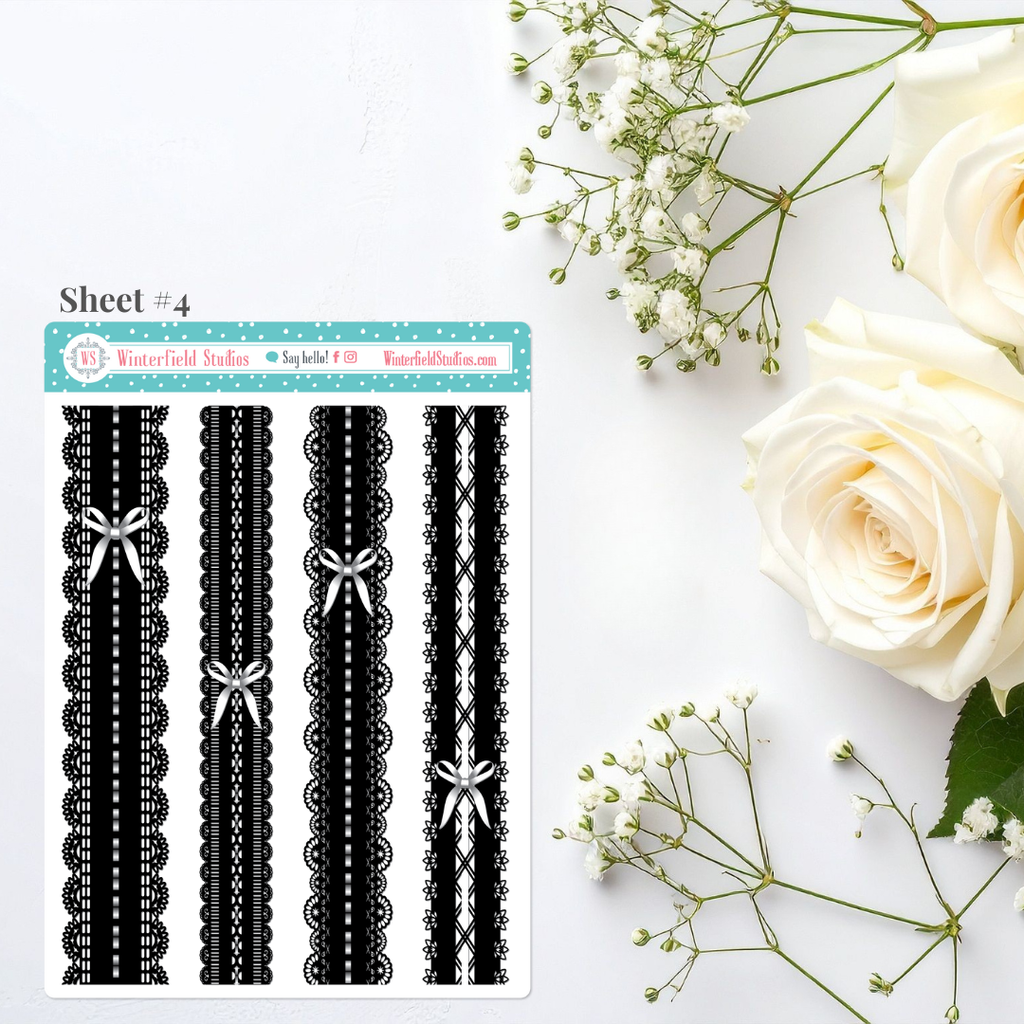 • 12 full sticker sheets (each packed with unique lace patterns, borders, torn edges, paint-splashed backdrops, and mixed-paper collages)