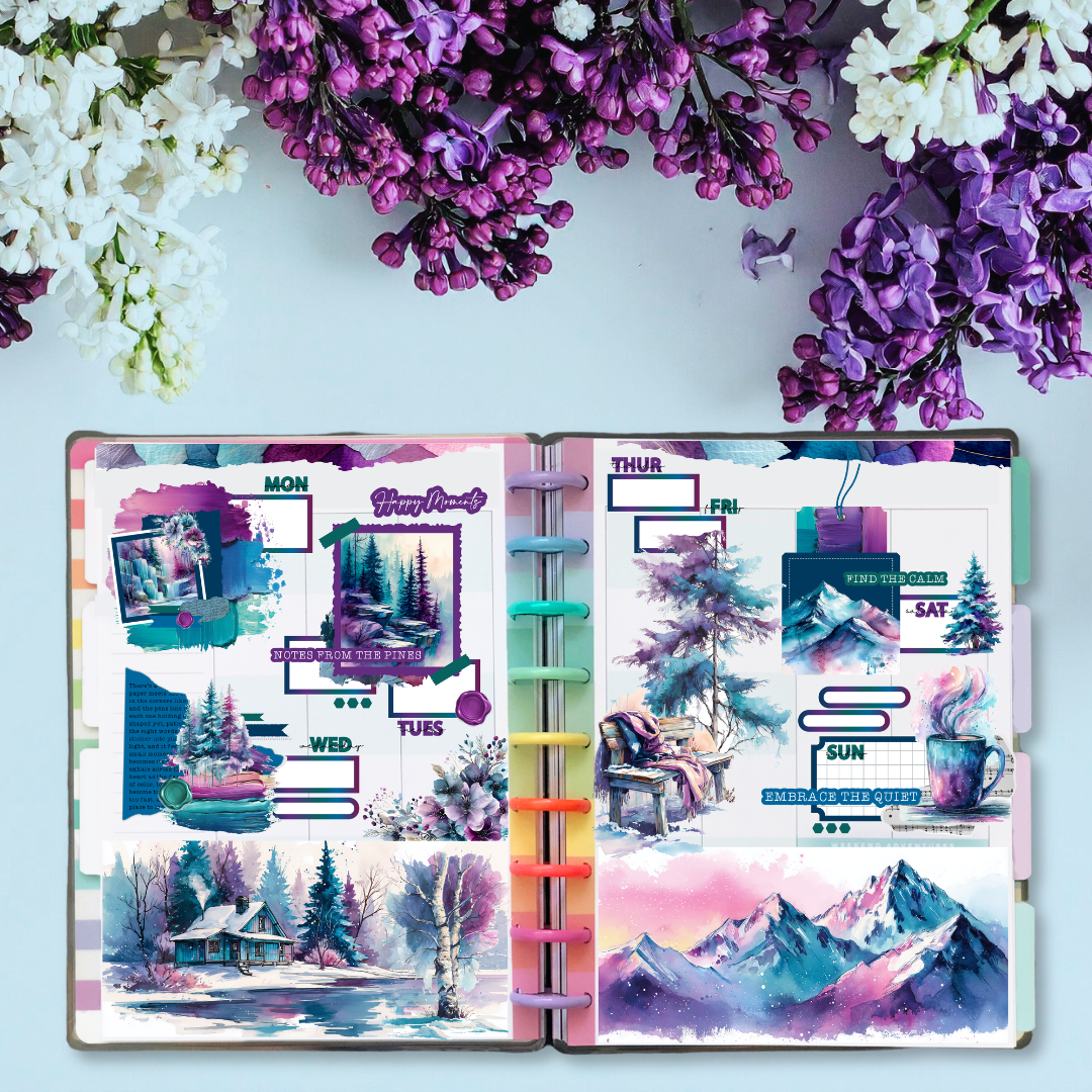 Step into a quiet winter world with Silent Summit, a breathtaking watercolour sticker collection designed for planners, journals, scrapbooks, and creative memory-keeping. This kit blends dramatic mountain scenes, snow-touched forests, frosted florals, mixed-media textures, and cozy cabin moments — all illustrated in a rich jewel-tone palette of plum, teal, midnight blue, and soft violet. Every sheet feels like a calm breath of winter air, perfect for capturing peaceful moments, documenting your thoughts, or building artistic layered spreads.