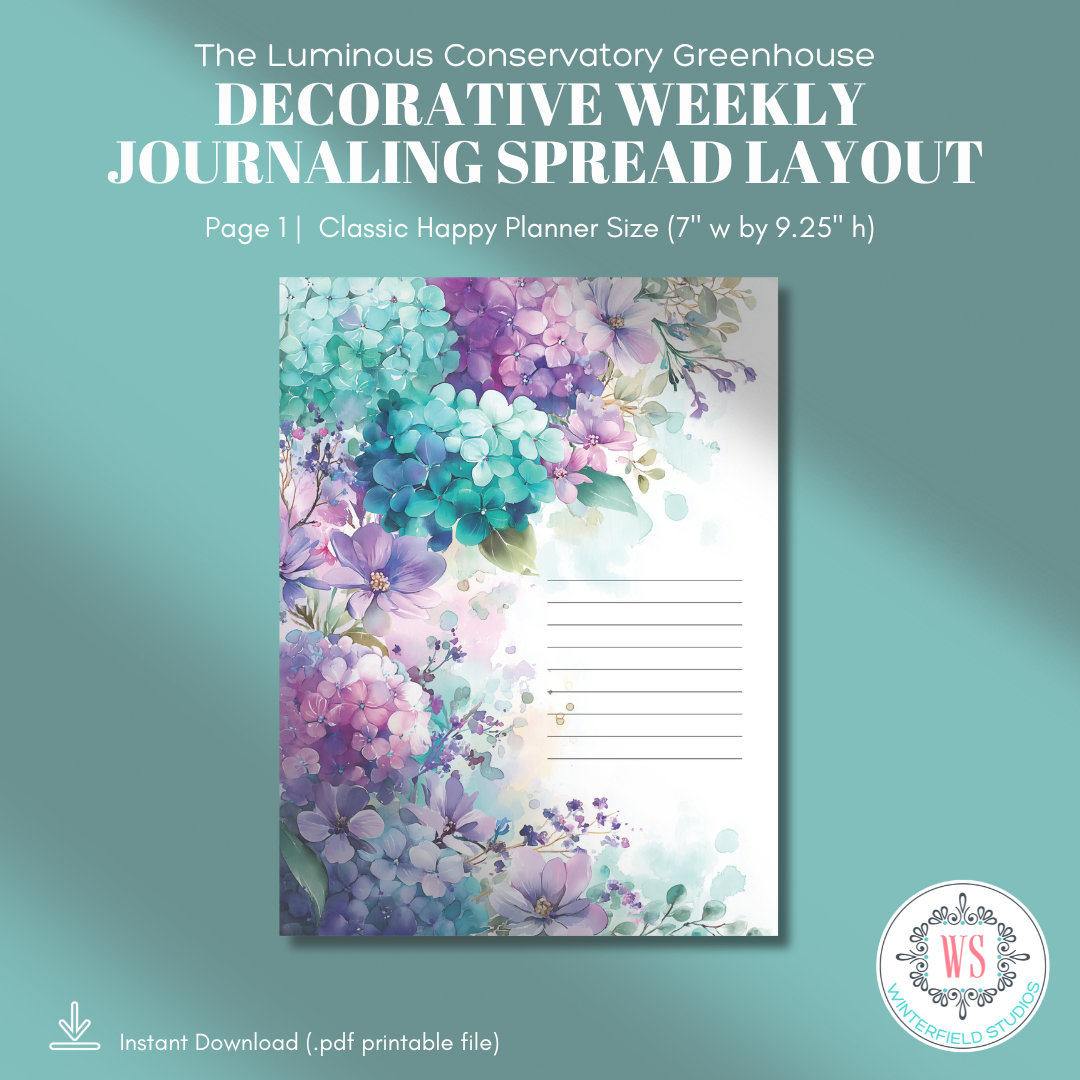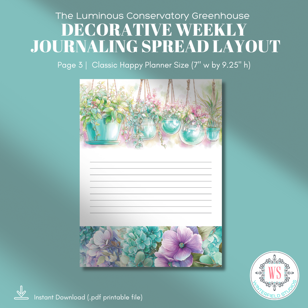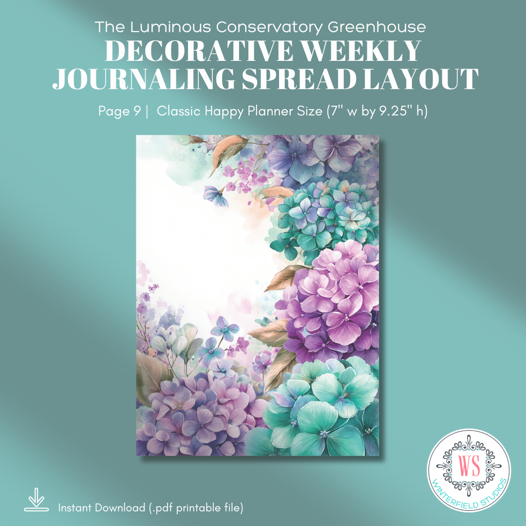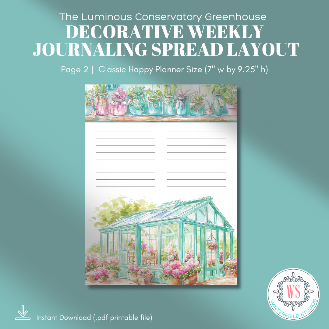 Step inside a sunlit greenhouse where glass panes glow in soft aqua light, hydrangeas spill from terracotta pots, and mason jars shimmer with cuttings waiting to root. The Luminous Conservatory Greenhouse is a romantic, botanical printable journaling kit designed for decorative weekly spreads, layered planner pages, and memory keeping with a fresh, airy feel.