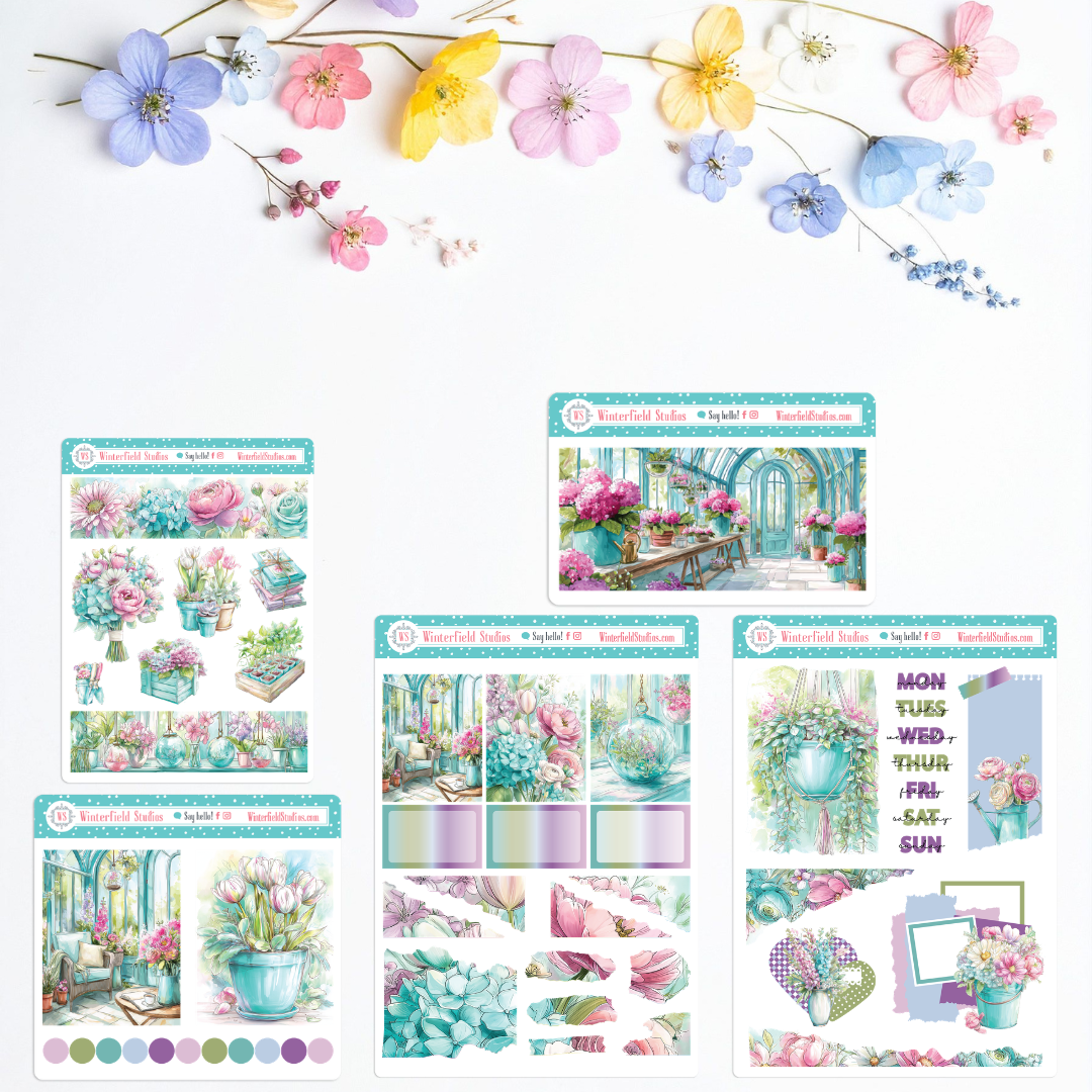 The kit also includes beautifully detailed botanical scenes and styled compositions, such as sun-filled greenhouse interiors with arched glass framing, potting benches lined with blooms, hanging glass terrariums suspended in light, and cozy seating corners surrounded by flowers. Decorative washi strips feature continuous floral borders and layered botanical panoramas that create seamless depth across weekly layouts. Smaller accent stickers include potted plant groupings, propagation trays, garden tools, stacked stationery, and floral arrangements in aqua enamel buckets and wooden crates.