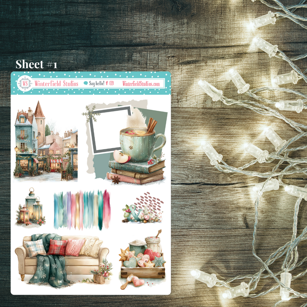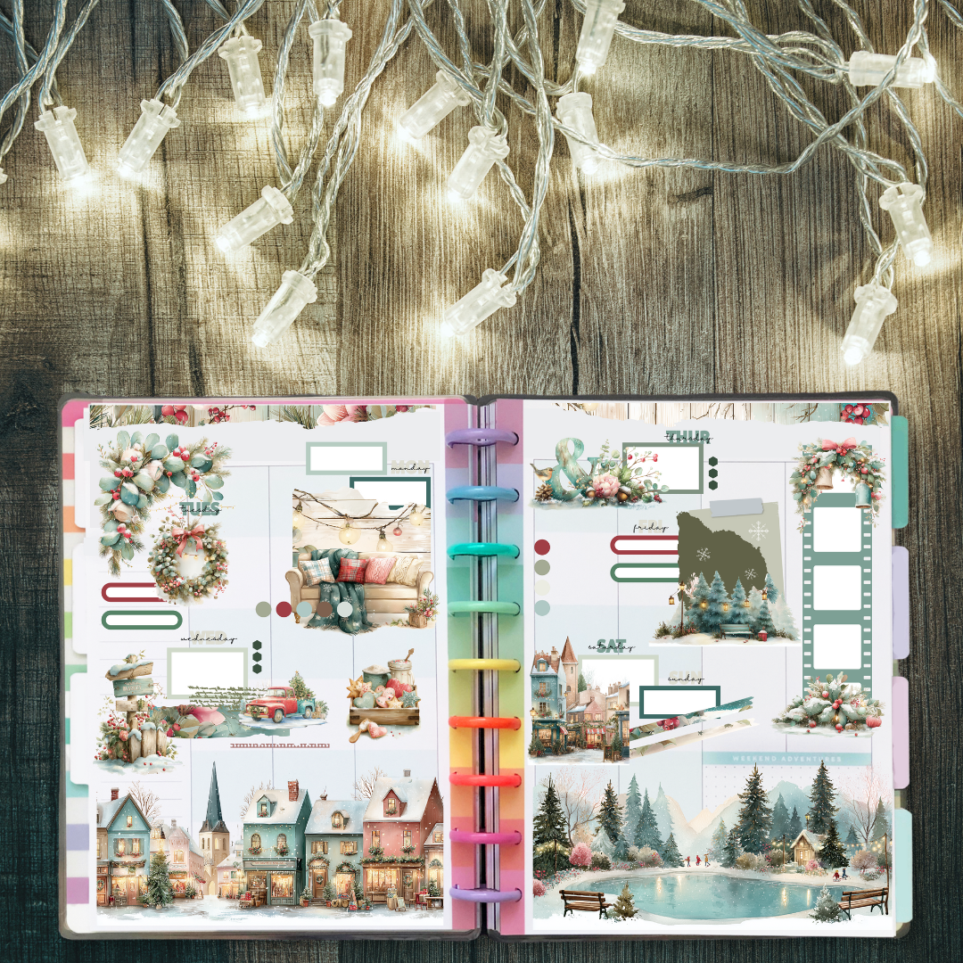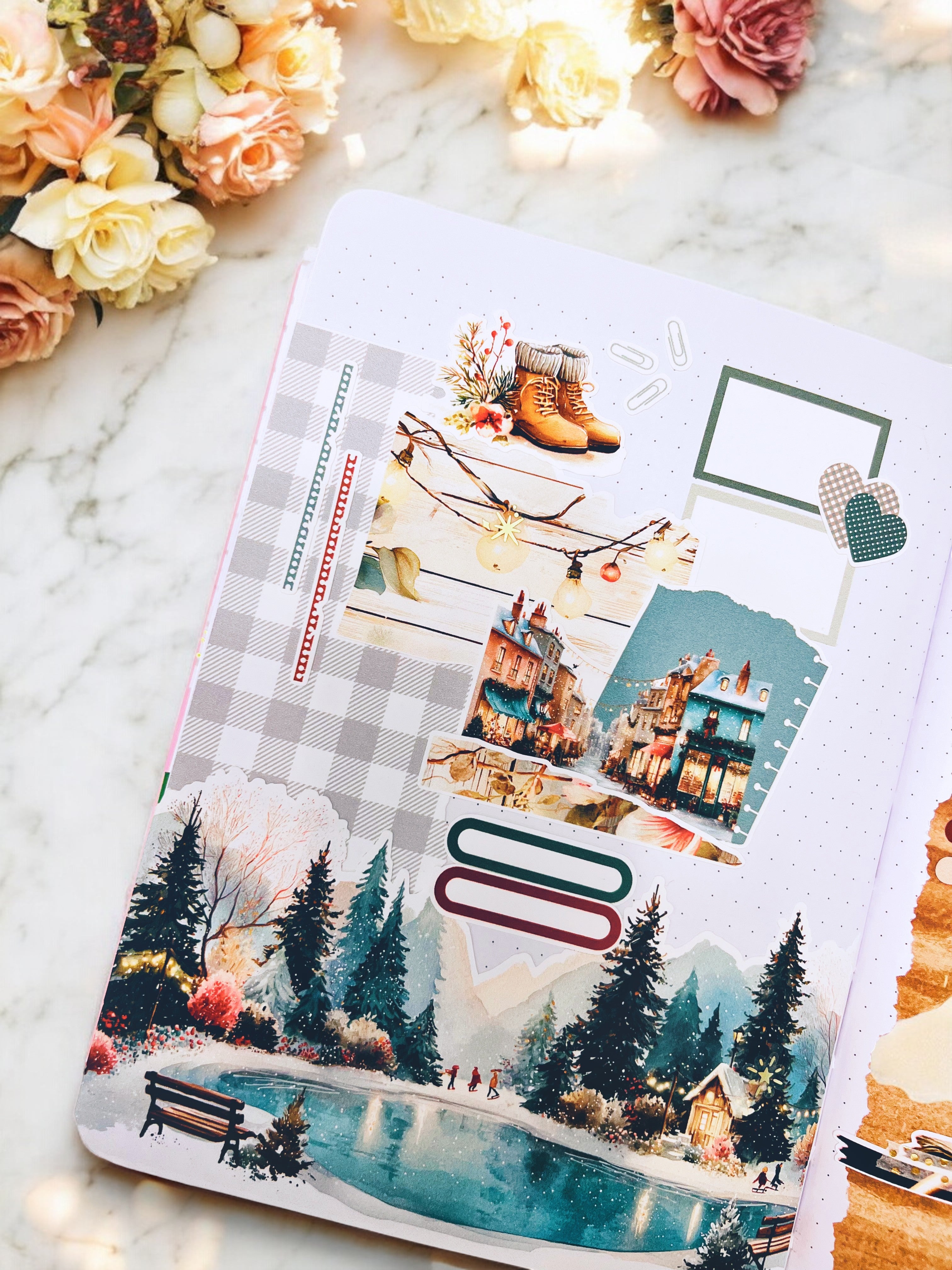 ✨ Designed for bullet journaling, memory keeping, and decorative planning, the stickers are perfect for marking holiday events, tracking festive to-dos, or simply adding seasonal charm to your pages. Imagine using the market street scenes to frame a weekly spread, or layering cozy winter details like blankets, boots, and lanterns to set the mood for your journaling.
