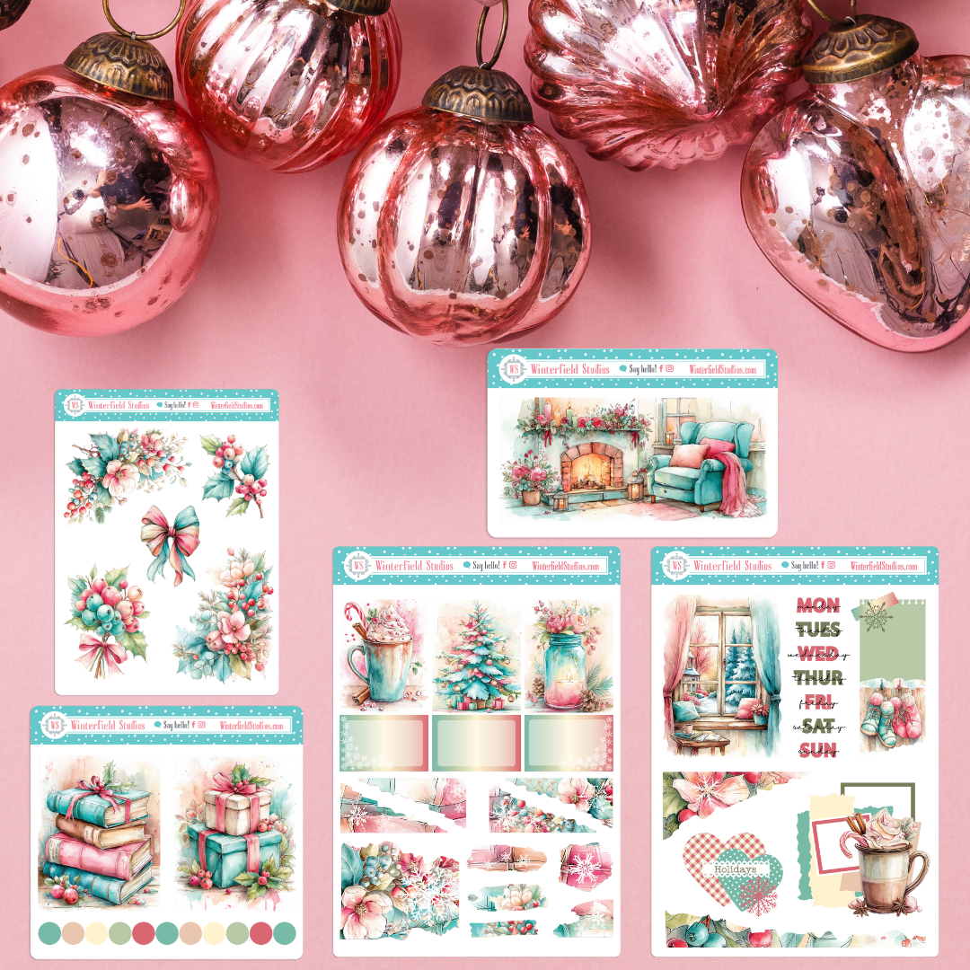 🎄 Designed in soft, nostalgic tones of dusty teal, blush red, and warm cream, this collection features beautifully illustrated scenes including a glowing fireplace, twinkling Christmas tree, and ribbon-tied gifts wrapped with love. Each piece feels hand-painted and layered with gentle texture — perfect for creating warm, story-filled spreads in your planner, journal, or memory book.